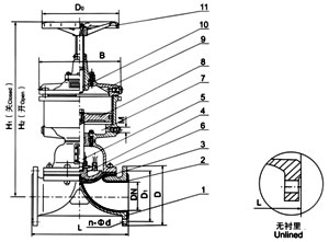 部件列表: 1、阀体 2、阀体衬里 3、隔膜 4、阀瓣 5、下阀杆 6、阀盖 7、气缸 8、活塞 9、气缸盖 10、上阀杆 11、手轮